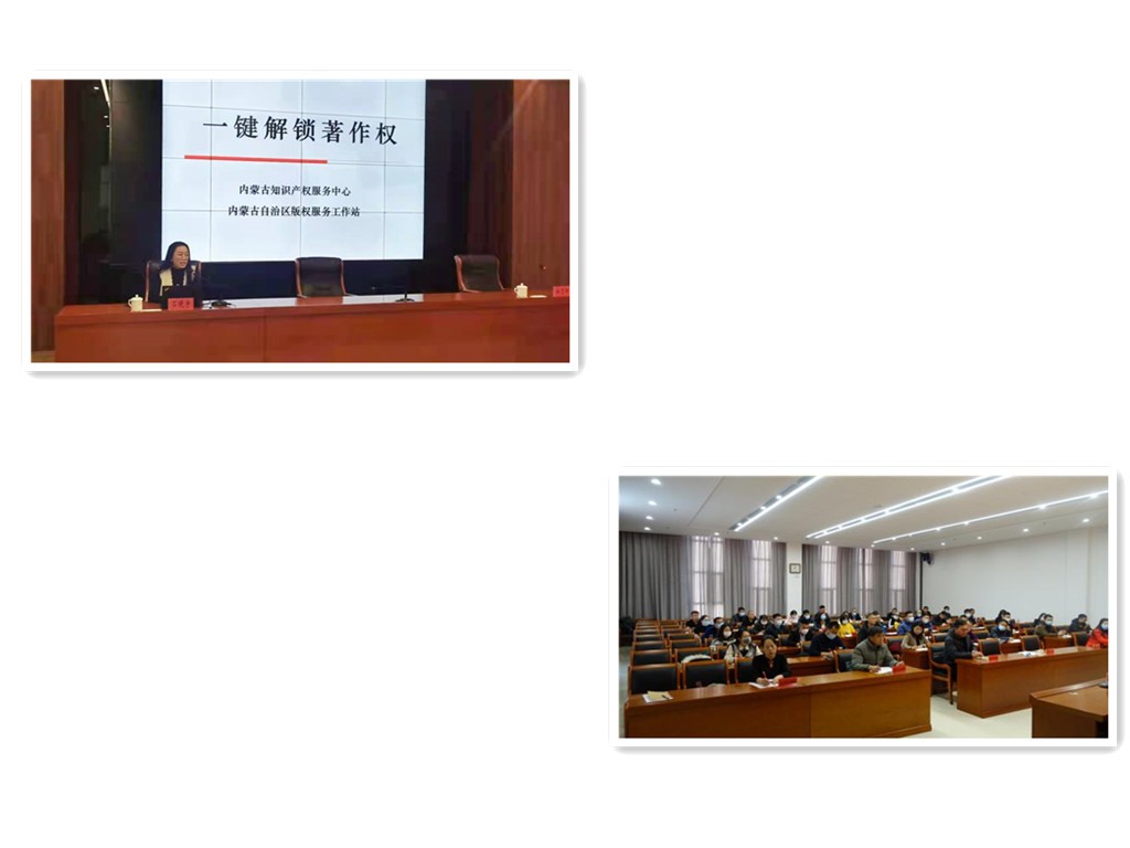 为深入学习贯彻中共中央、国务院印发的《知识产权强国建设纲要(2021-2035)》,进一步推动新《著作权法》学习宣传工作,帮助版权行政执法人员深入了解新时代版权工作的新特点、新规律、新要求,2021年12月8日,内蒙古知识产权服务中心(自治区版权服务工作站)安排专业师资走进呼和浩特市版权工作培训班,为呼和浩特市旗县区委宣传部、市级有关成员单位及市、县两级文化执法人员以及相关业务人员共计50余人进行了版权知识培训。