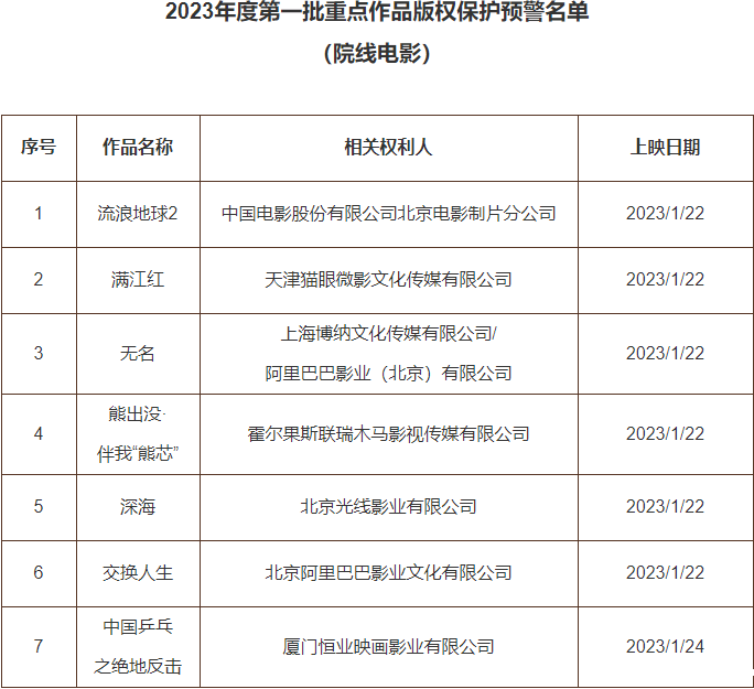 按照国家版权局《关于进一步加强互联网传播作品版权监管工作的意见》及版权重点监管工作计划,根据相关权利人上报的作品授权情况,现公布2023年度第一批重点作品星空体育app下载官网预警名单。