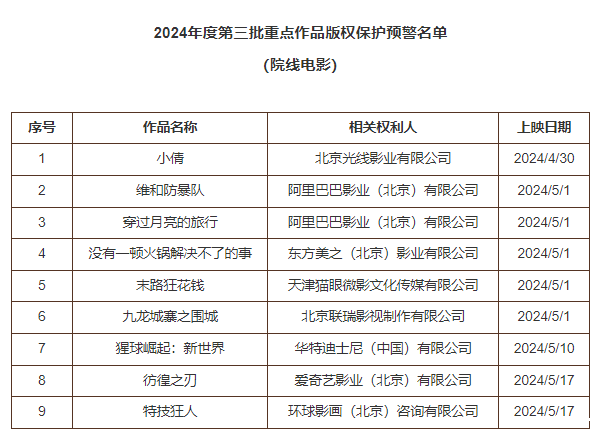 按照国家版权局《关于开展院线电影星空体育app下载官网专项工作的通知》《关于进一步加强互联网传播作品版权监管工作的意见》及版权重点监管工作计划,根据相关权利人上报的作品授权情况,现公布2024年度第三批重点作品星空体育app下载官网预警名单。