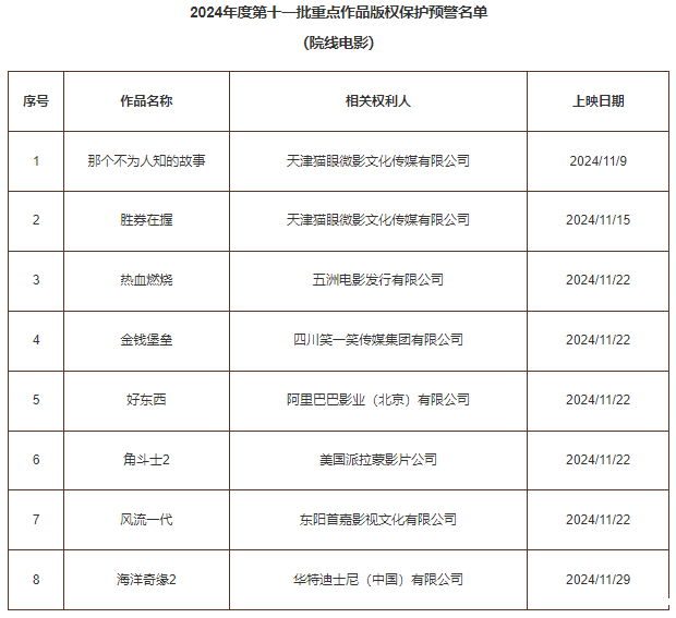 按照国家版权局《关于开展院线电影星空体育app下载官网专项工作的通知》《关于进一步加强互联网传播作品版权监管工作的意见》及版权重点监管工作计划,根据相关权利人上报的作品授权情况,现公布2024年度第十一批重点作品星空体育app下载官网预警名单。